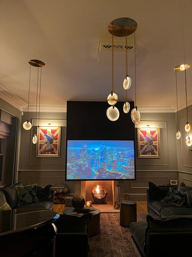 With extremeley high ceilings the biggest challenge on this project was how to seamlessly integrate technology into the room without it ruining the aethetic. Luckily as we manufactuer our ceiling recessed screens in house we are able to add additional black borders to the top of the fabric. This means that on this project the screen can retract down further putting the viewable area of the screen at a comfortable height. High ceilings no longer an issue.